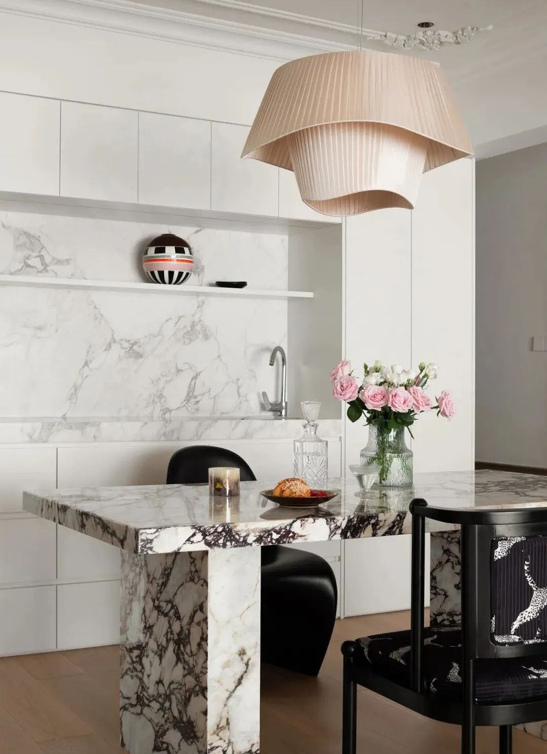 餐厅,宝格丽大理石的餐桌搭配复古吊灯,黑白交织的纹理,由视感带来起伏的层次感,充满简约优雅的美感,自然烘托用餐氛围情调。