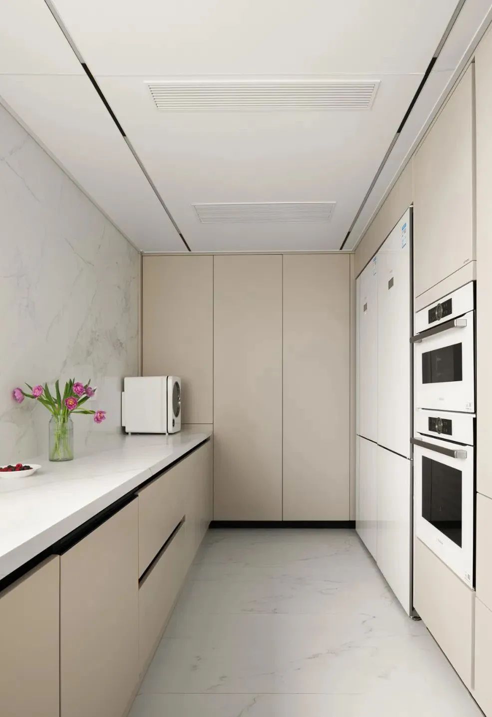 厨房,采用浅色系橱柜搭配,U字型布局双向走动双操作台,嵌入双开门冰箱、蒸烤箱,与整体造型融为一体,打造实用功能型厨房。