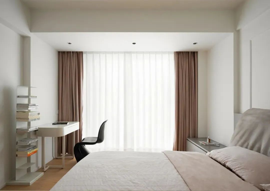 空间色彩搭配温柔知性,卡其色窗帘呼应木色地板,营造出温馨舒适的休息环境,靠窗布置落地简易书架+书桌椅,打造一处休闲阅读区。