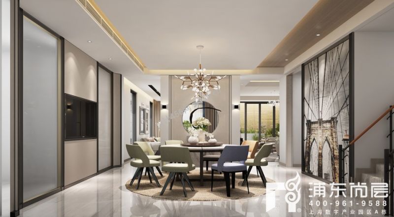360平别墅新中式风格餐厅圆形隔断效果图