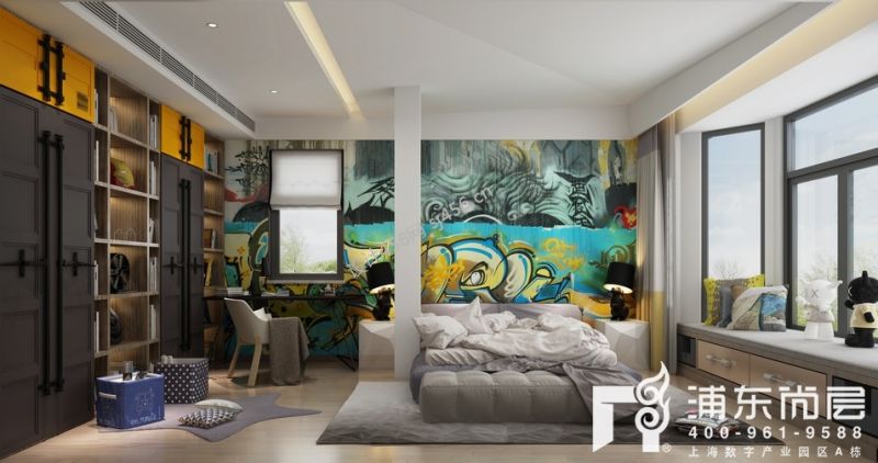 360平别墅新中式风格手绘儿童卧室背景墙设计图片