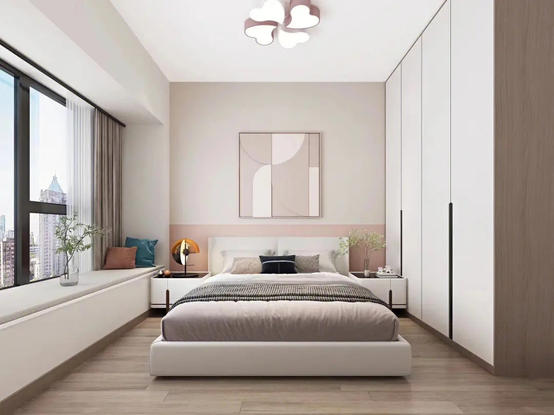 卧室是用来休息的地方,硬装部分不用多做一些复杂的造型,线条简洁的吊顶设计、舒适脚感的木地板、简洁的装修更有利于睡眠。