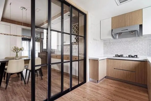 把厨房与餐厅之间的夹墙的一半做成了玻璃隔断,这样不会让厨房内的东西在外边全部都能看到,如果厨房还在做饭的话也能在餐厅里就能照顾到厨房的情况。