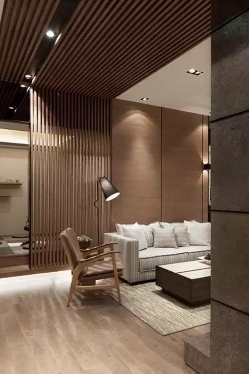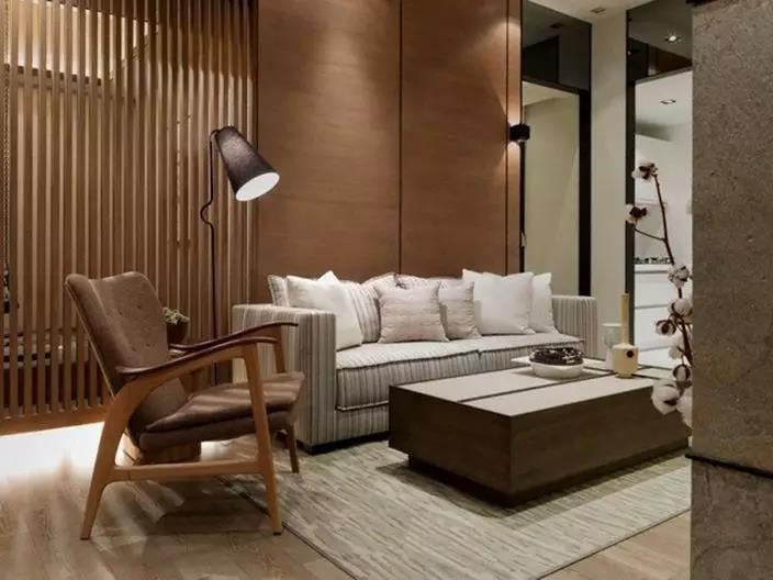 客厅木色的背景,与米白色的家具形成了对比,一种深邃的感觉.