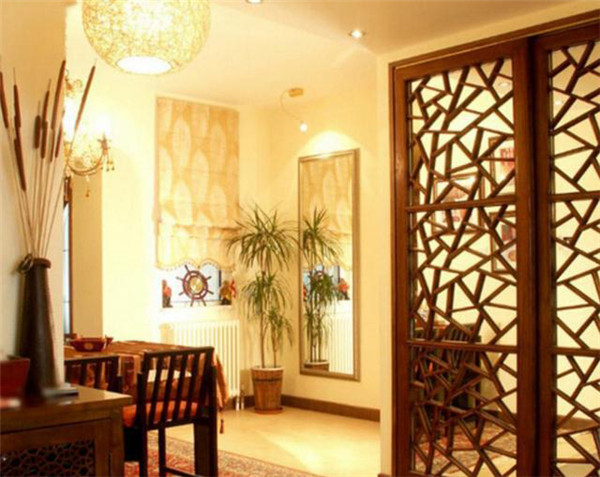 1.格栅围屏式:以带有不同花格图案的透空木格栅屏做隔断。富有艺术氛围,既有通透性,又可分隔空间。