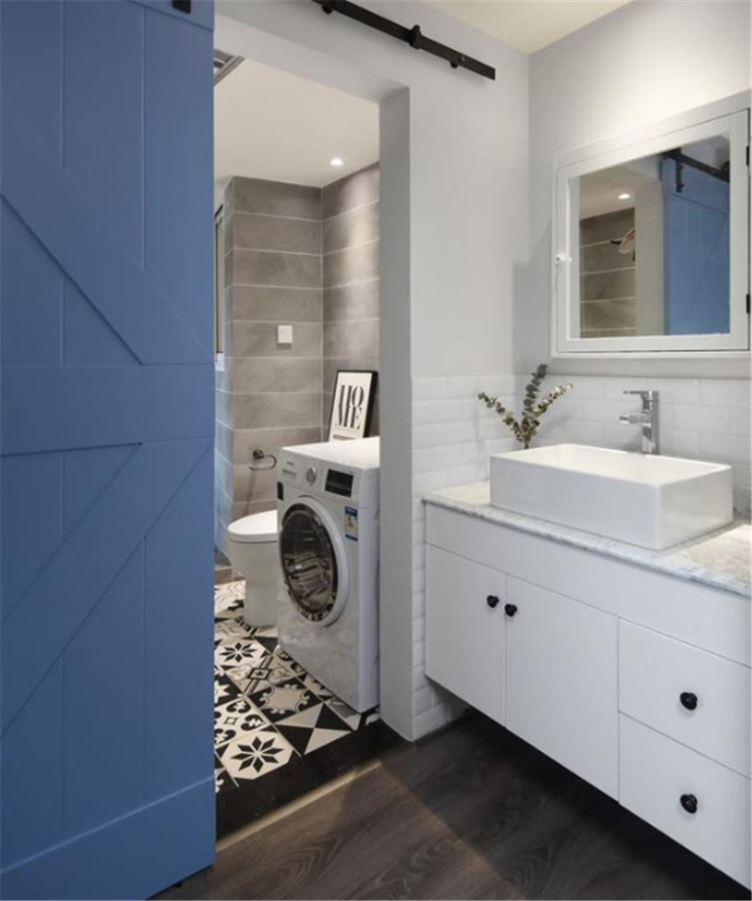 小户型的卫生间,在色彩搭配上,不建议超过三种,和穿衣一样,颜色多就显的乱,一般来说,浅色的墙面,搭配深色地面,如果还想来点小新意,可以在马桶、洗手台区域,再用小花砖进行点缀。