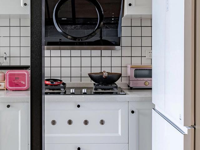 厨房空间实在是太小,为了避免烹饪的时候,油烟的扩散,安装的是玻璃推拉门做隔断,打造了一个独立的厨房。白色的橱柜和吊柜一体化靠墙设计,这样多出的走廊空间,也显得宽敞,不会特别拥挤,橱柜台面分区很明确,烹饪也十分的舒适。