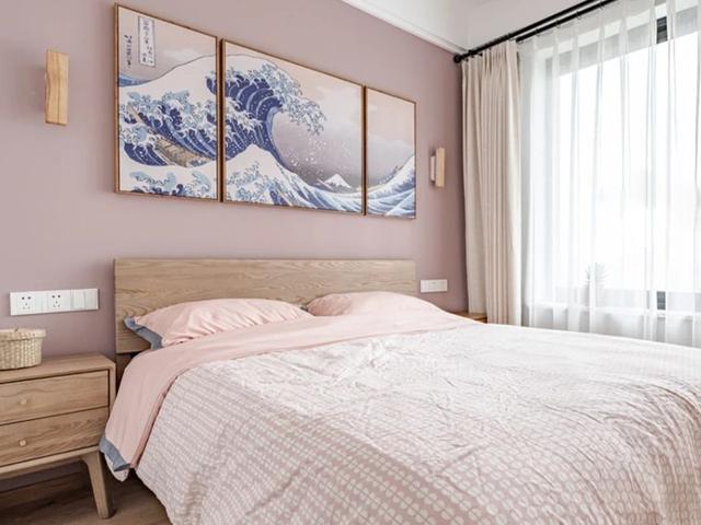卧室的装修很具日式的格调,纯色的墙壁,挂的是三联组合艺术风景壁画,充满了日式风情的那种壁画,显得很具艺术气息。原木色的家具进行空间的摆放,实木材质木纹清晰自然,充满了日式的那种淡雅格调,这样的卧室虽然不大,但是居住却很具生活的气息。