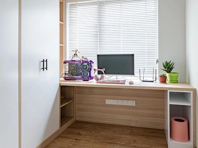 卧室设计了一个独立的衣帽间,打造的是一排的衣柜和转角设计的办公桌,这样既能实现衣物的收纳,也能拥有一个独立的办公区域,可以当做小书房使用。原木色的柜子与实木地板相互搭配,也极具日式的素雅感,空间角落利用的很到位,没有造成空间浪费。