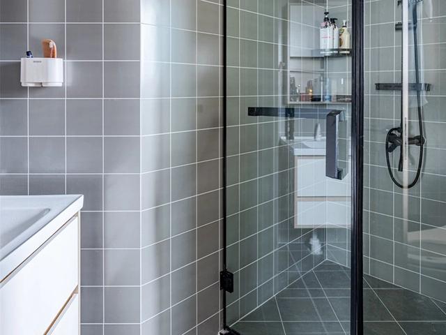 卫生间不规则设计,空间利用的很到位,角落空间也没有浪费,设计的是弧形的淋浴房,安装的是黑色玻璃的淋浴门,沐浴以后会更方便,实现了干湿分离。卫生间的墙壁和地面铺的是灰色的瓷砖,显得十分的简约素净,这样的卫生间也很洁净,平时很好清洁。