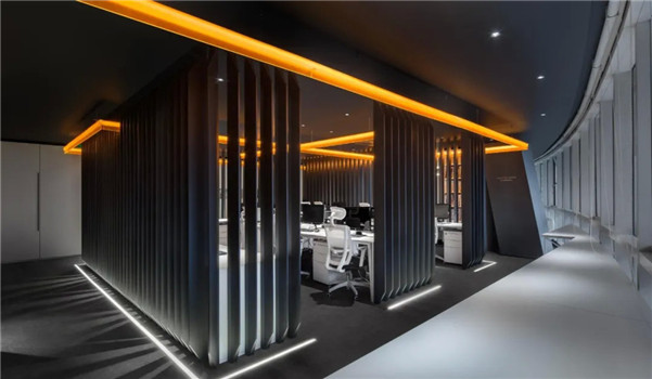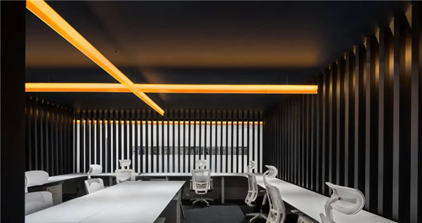 像案例中的这个办公空间,黑白背景下,天花上加入了一条橙色的灯带贯穿进整个空间。橙色的光线根据人流动线的方向向前延伸它的轨迹,在视觉上是整个空间的亮点,在功能上又起到了视觉引导的作用。