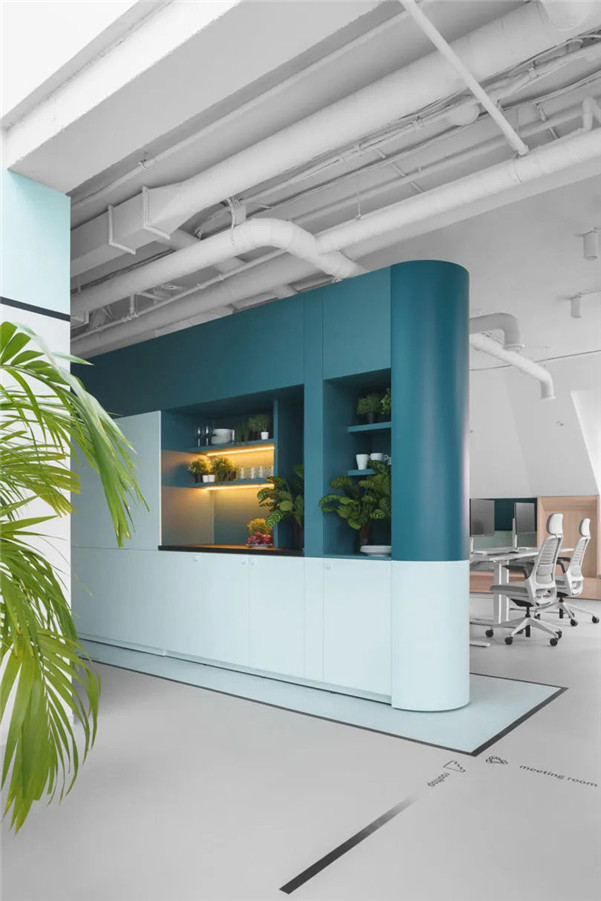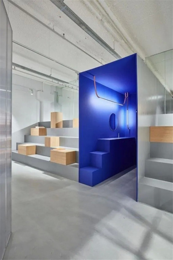 以上2个案例都是用一个色块填充一个局部空间,在大面积的无彩色中用有彩色点亮了空间的视觉重点。一个是用蓝色划分出一个独立的卫生间区域,一个是用粉色划分出一个独立的茶水间区域。