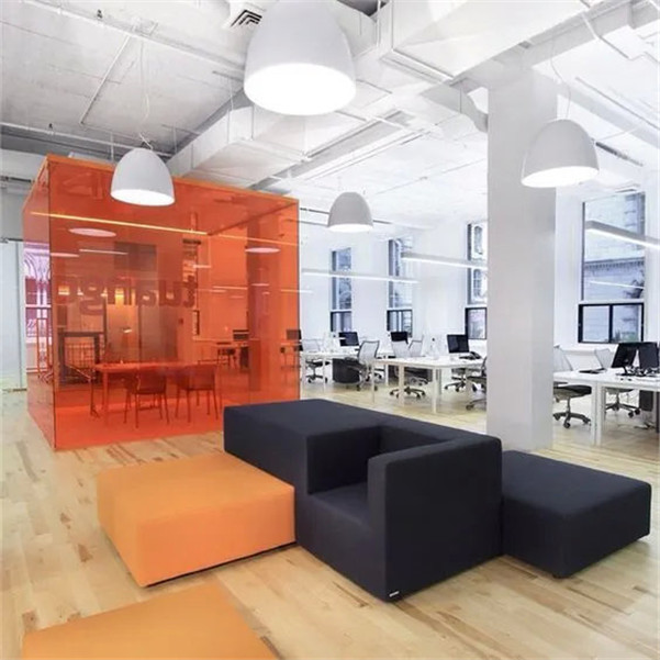 在材质上做色彩处理也是很实用的打造视觉中心方法。就像图中,在玻璃材质的基础上加上了红色,直接围合出一个治谈的空间,在空间中特别醒目。