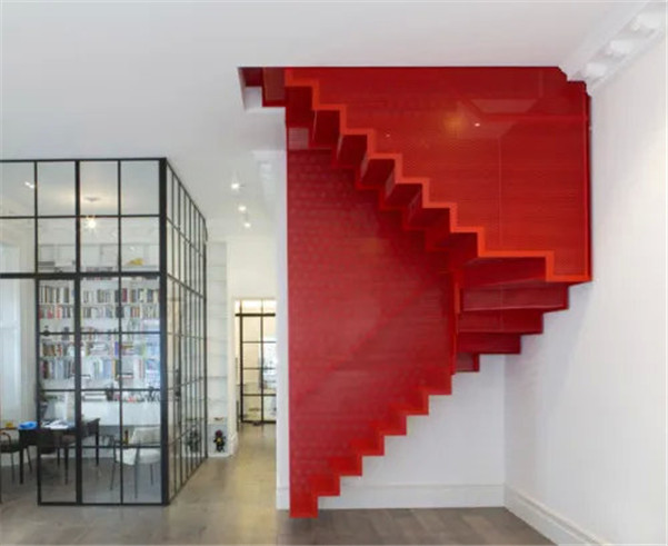 ① 直接把楼梯的部分,用红色色块来处理,直接处理成一个空间的亮点,非常吸引人眼球。