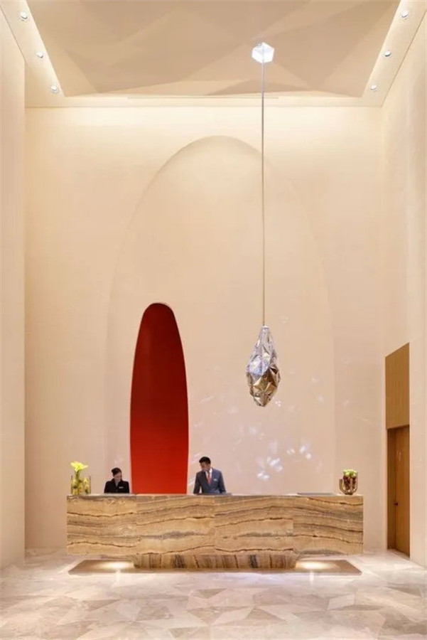 ② 也是相同的手法,在局部用一抹红色点亮整个服务台的区域,并在轮廓上和主体的背景墙有一个呼应,色彩上又特别醒目,这就是一种色彩的亮点表达。