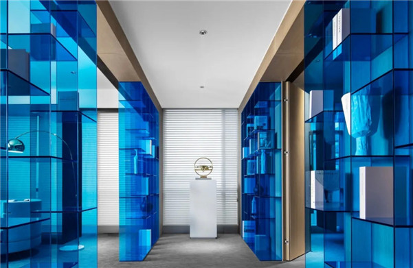 就像下面这个案例,在这种小面积木色的结构下,做了一组蓝色透明的玻璃隔断。
