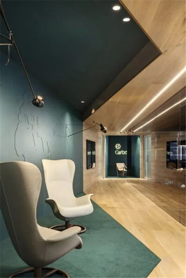 第二个案例也是在大面积的木色下,做了一个墨绿色视觉区域,用暖色的木色和冷色的墨绿色做一个冷暖对比,清晰的划分出过道的空间和治谈空间。