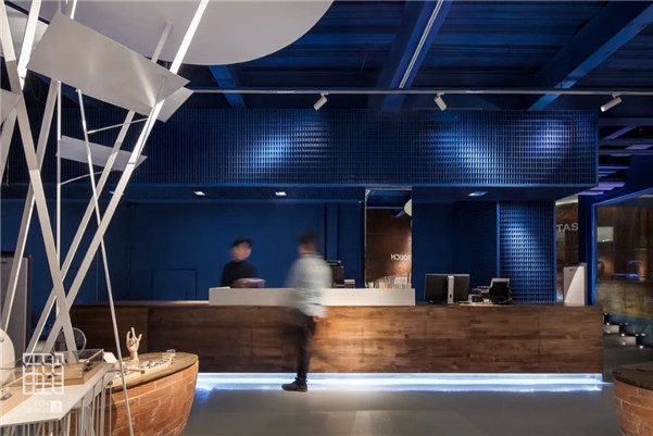 还有下面这种在大面积的蓝色背景做一个木色的吧台,突出吧台的存在感,用这种冷暖对比来划分空间的区域,表达空间的重点。