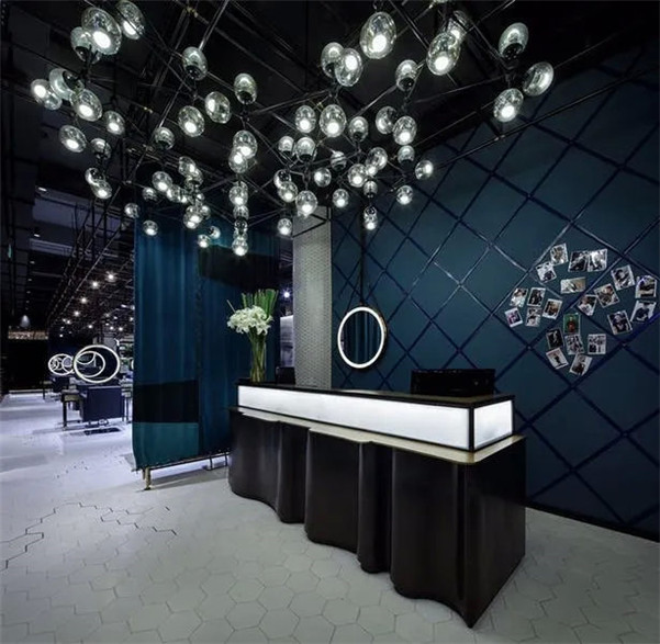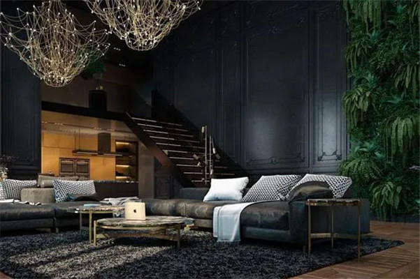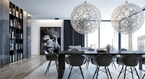 2、黑色空间中的点亮处理巴黎公寓重点表达的是装饰性,不是功能区域的划分了。在大面积的黑色背景下,加一个高明度的白色的网状吊灯,直接把这个吊灯做成空间的亮点,这也是明暗对比的另一种表达方式。