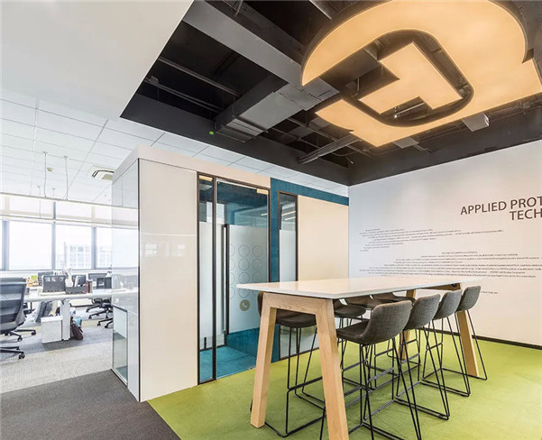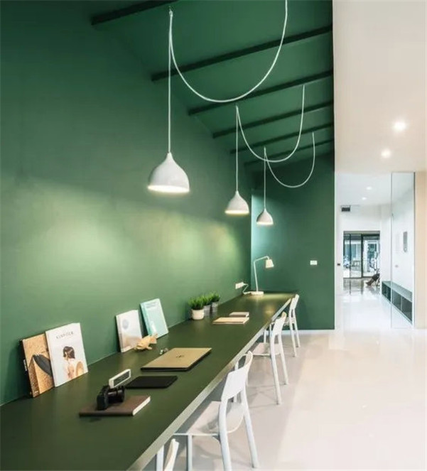 4、低明度区域划分像下面这个办公空间,直接在浅色的环境下,用低明度的绿色来划分出独立的办公区,以此来实现在明度的层面上来表达空间的视觉重点,划分空间的功能区域。