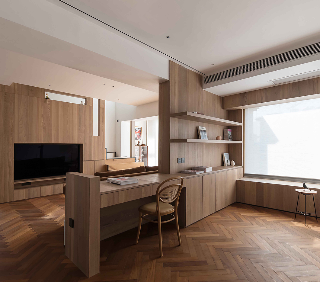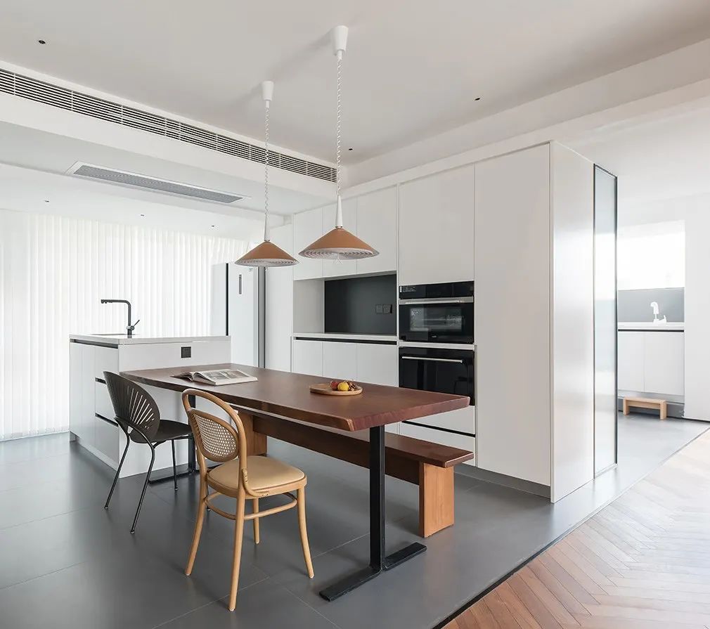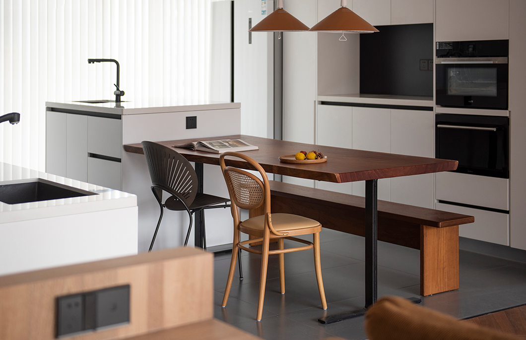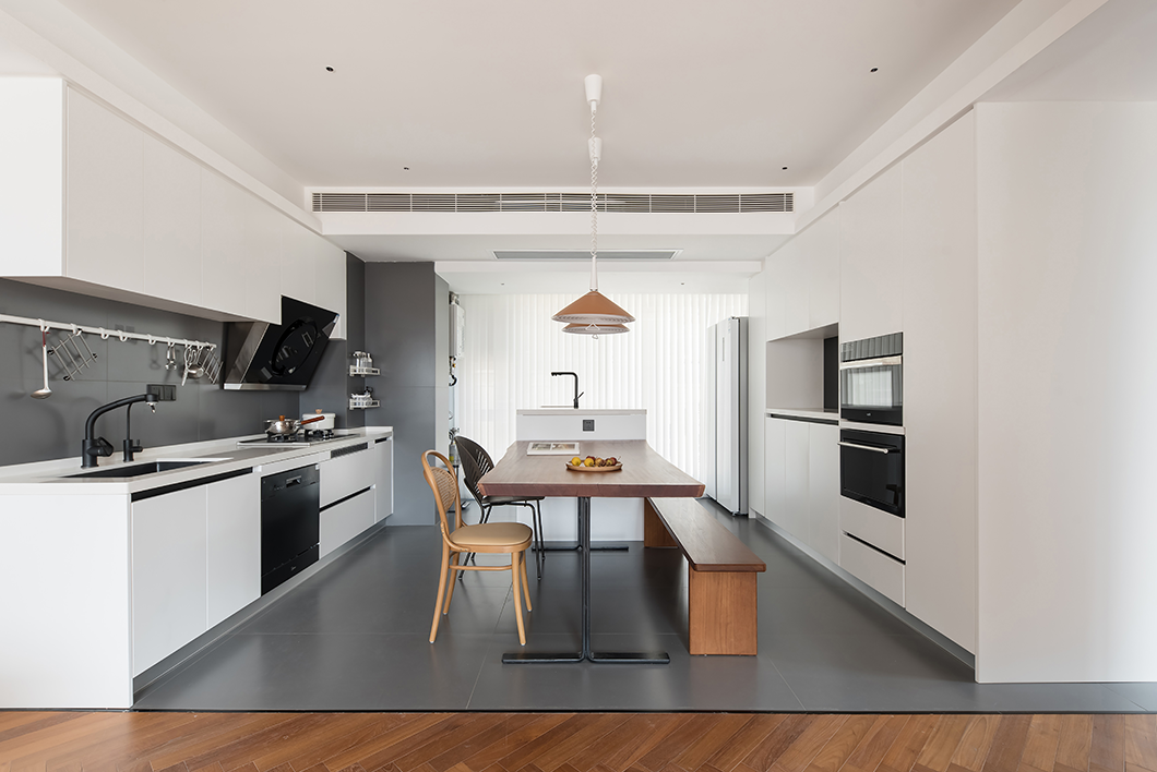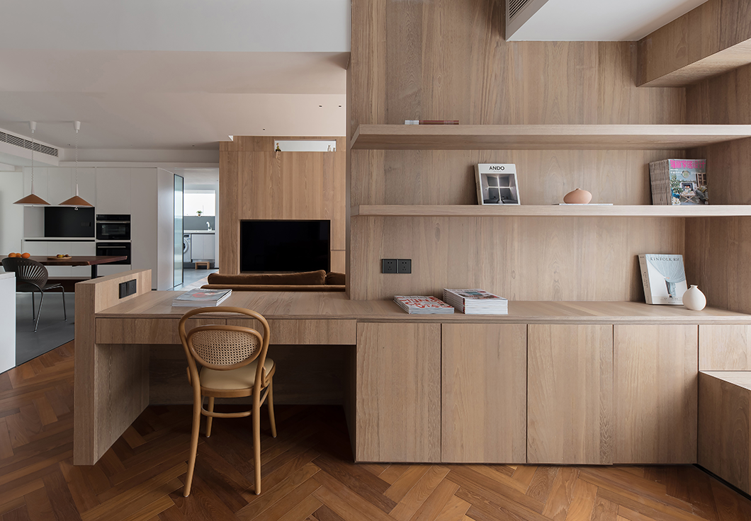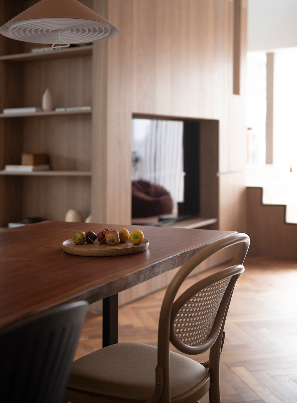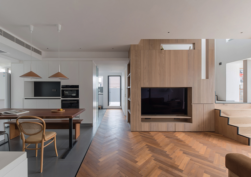 公共区域在白色的基底下,使用大量的木质元素从纹理自然的木地板到餐桌、木饰面,木材温润的色泽给空间带来质朴的舒适感,营造了一种悠然、放松的生活方式,增添室内的温暖与舒适。