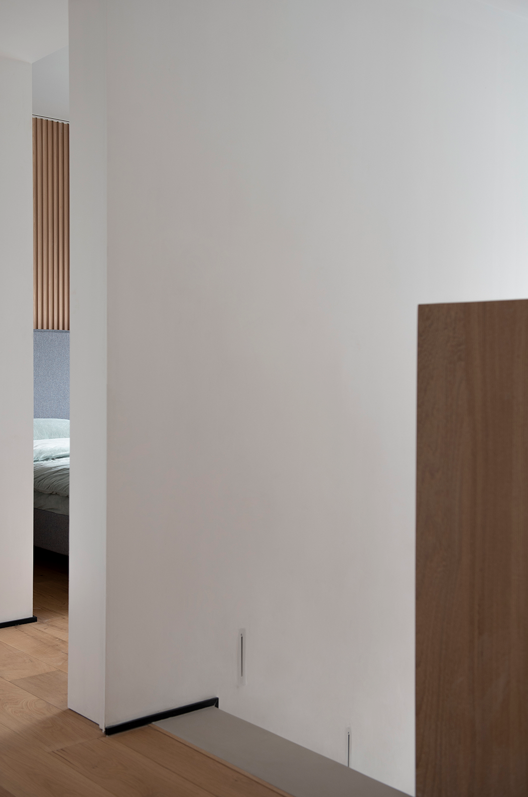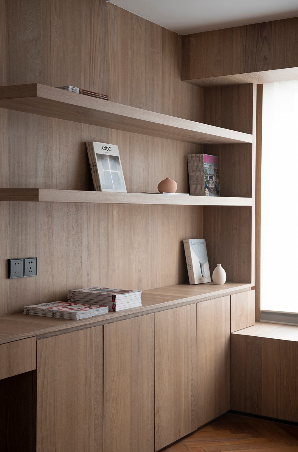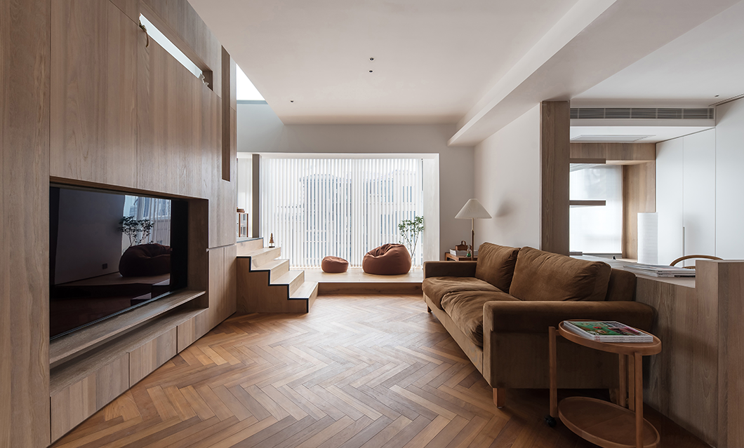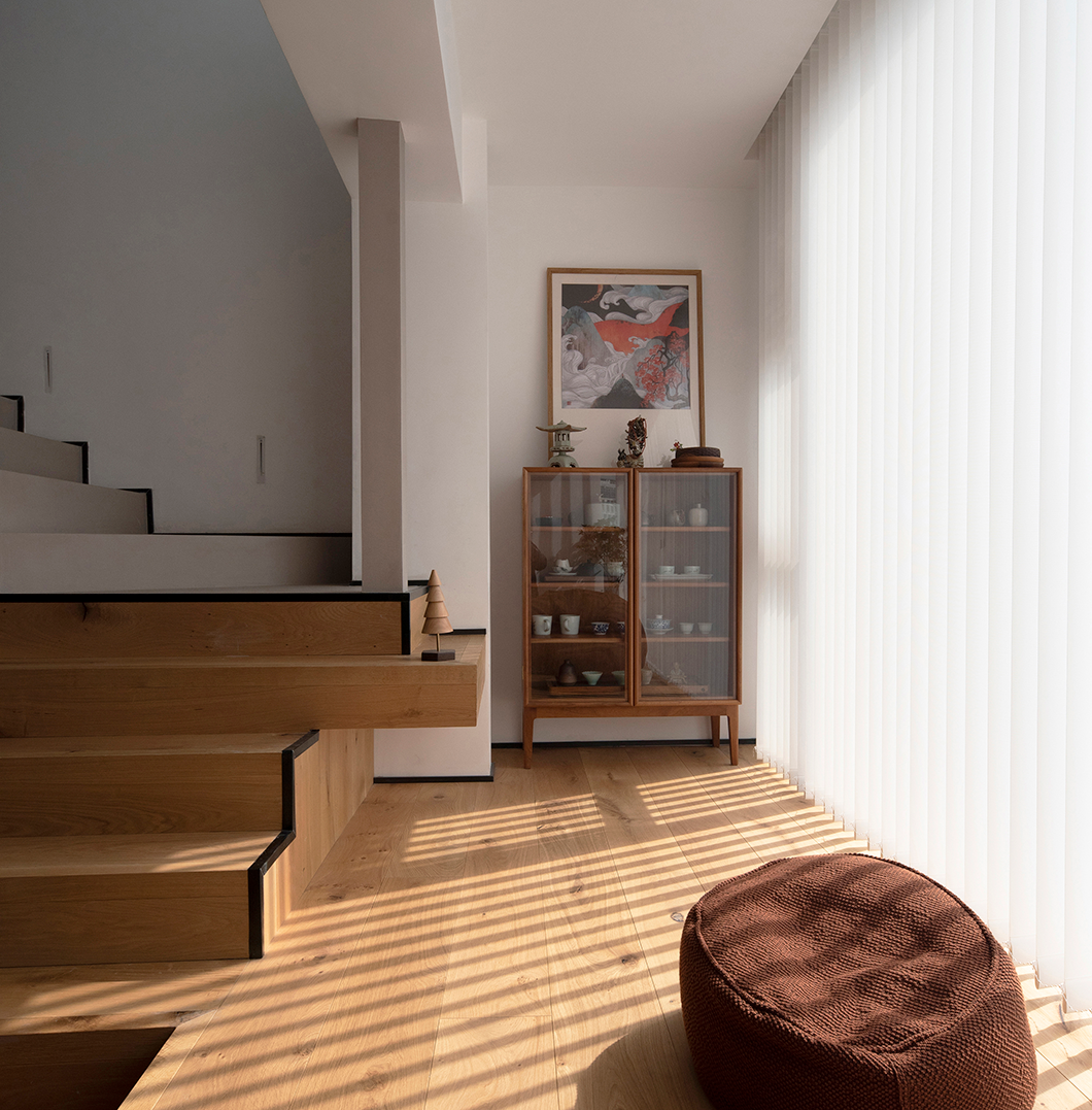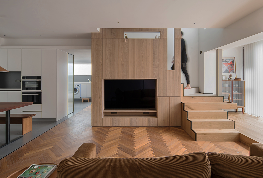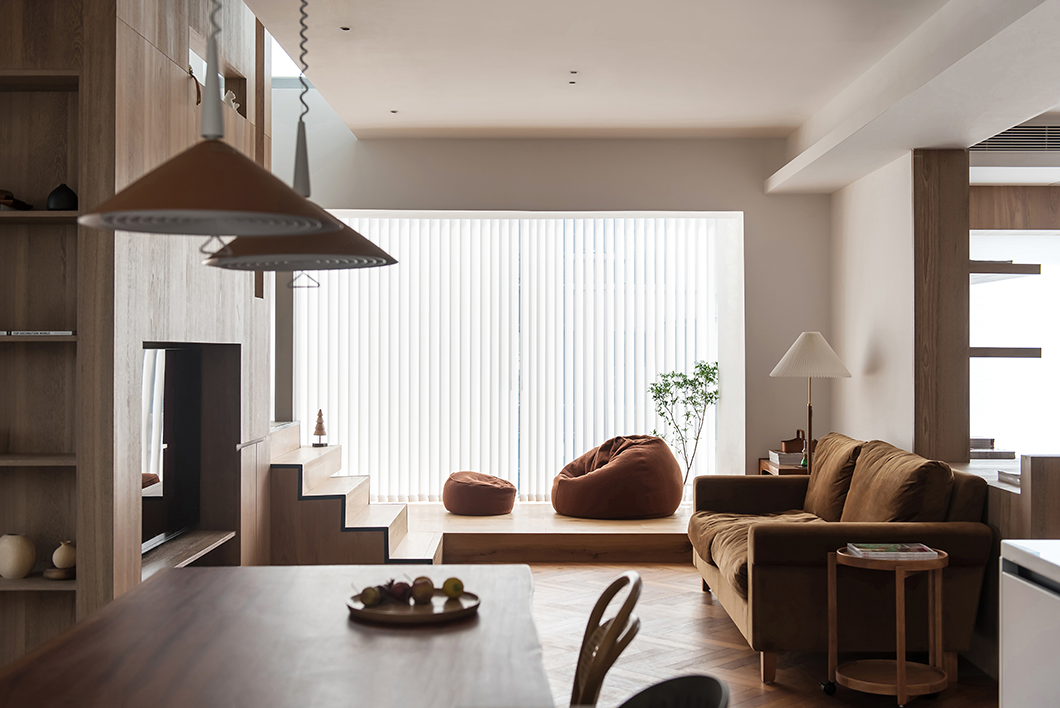 公共区域在白色的基底下,使用大量的木质元素从纹理自然的木地板到餐桌、木饰面,木材温润的色泽给空间带来质朴的舒适感,营造了一种悠然、放松的生活方式,增添室内的温暖与舒适。