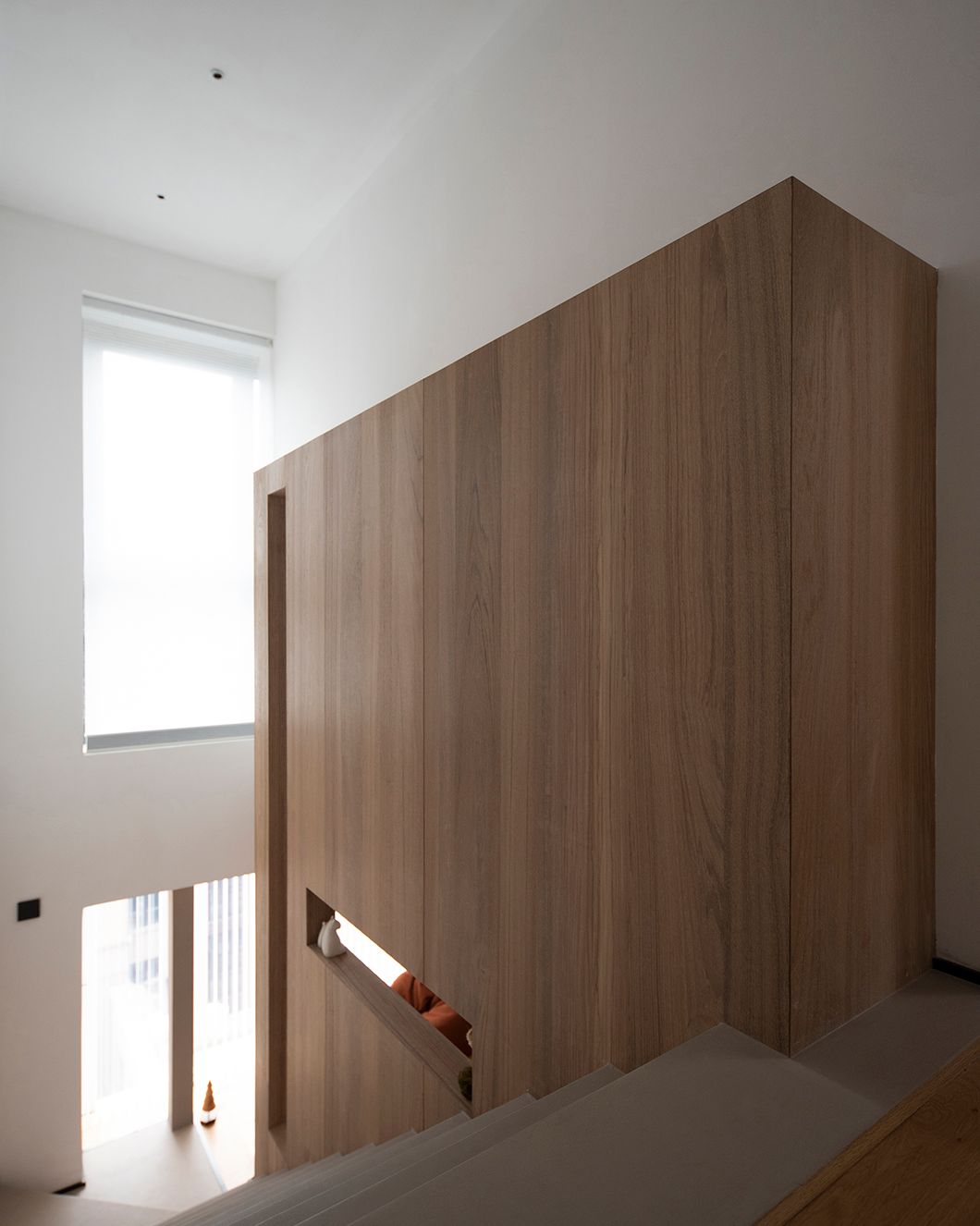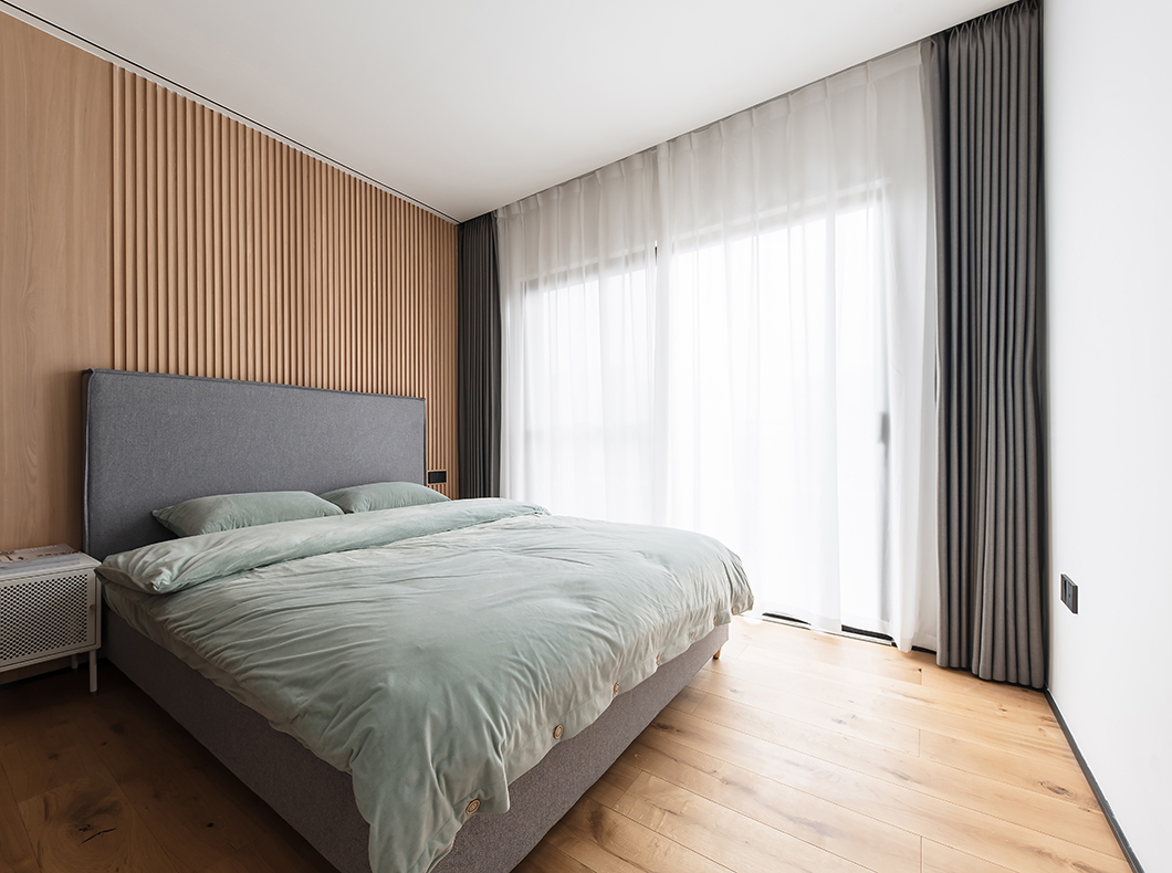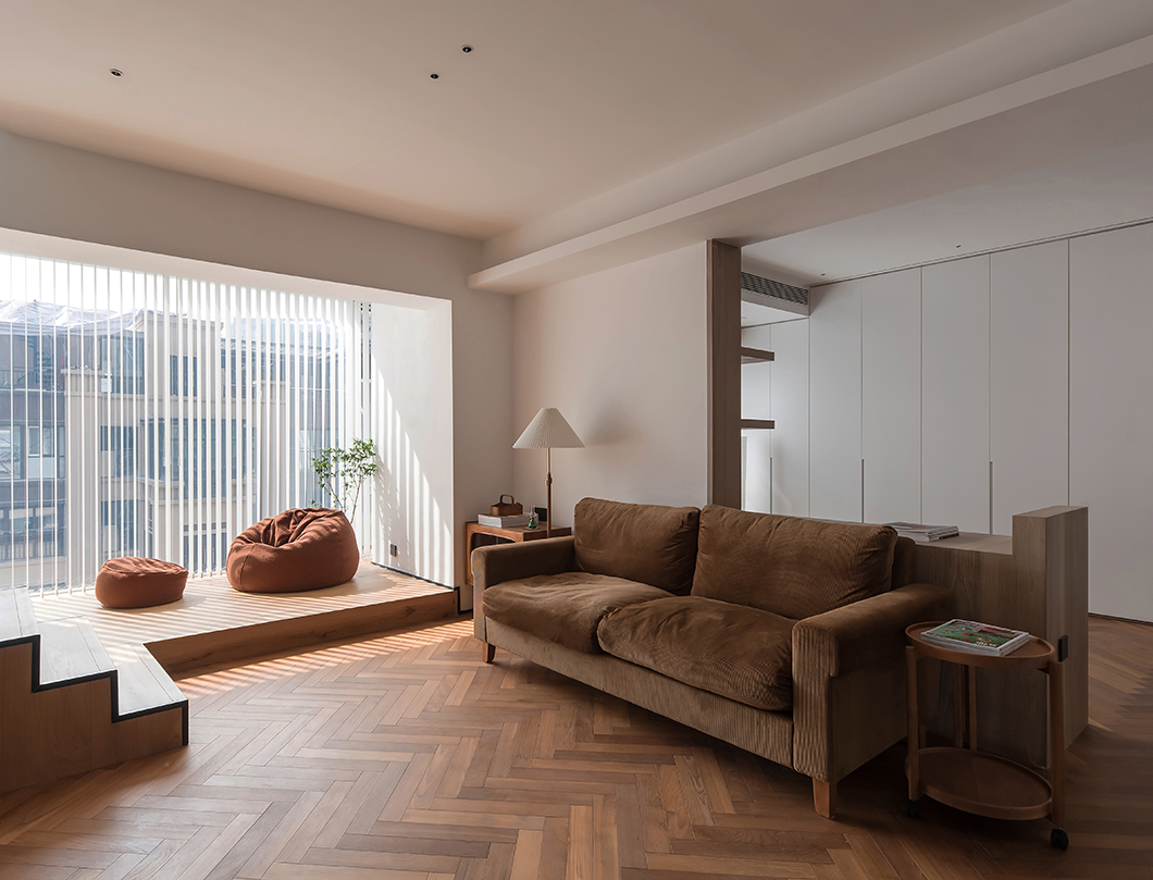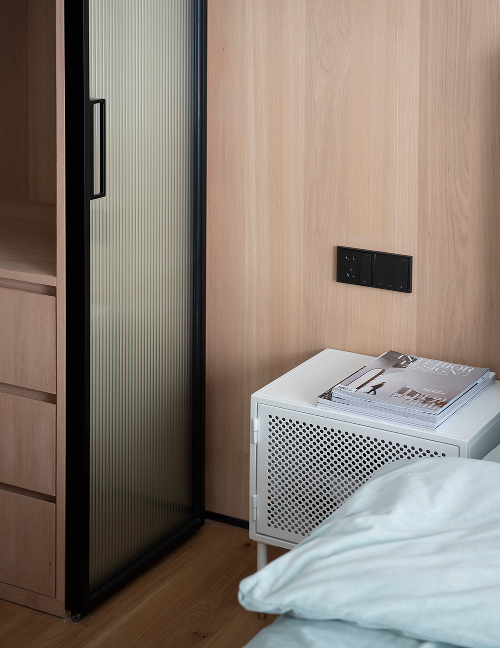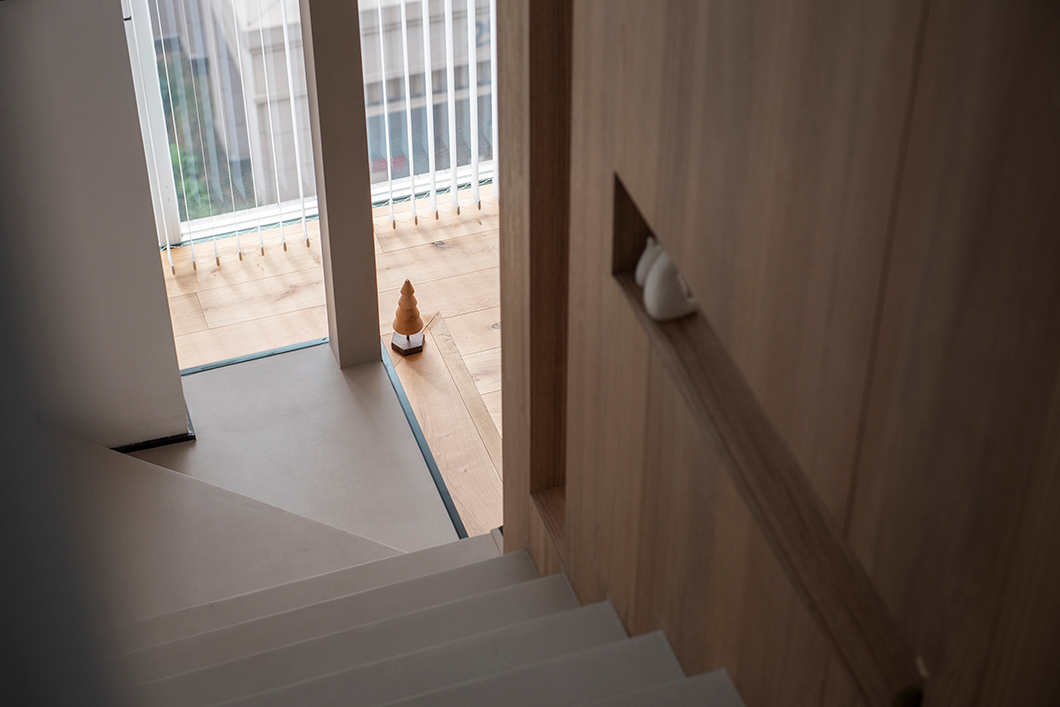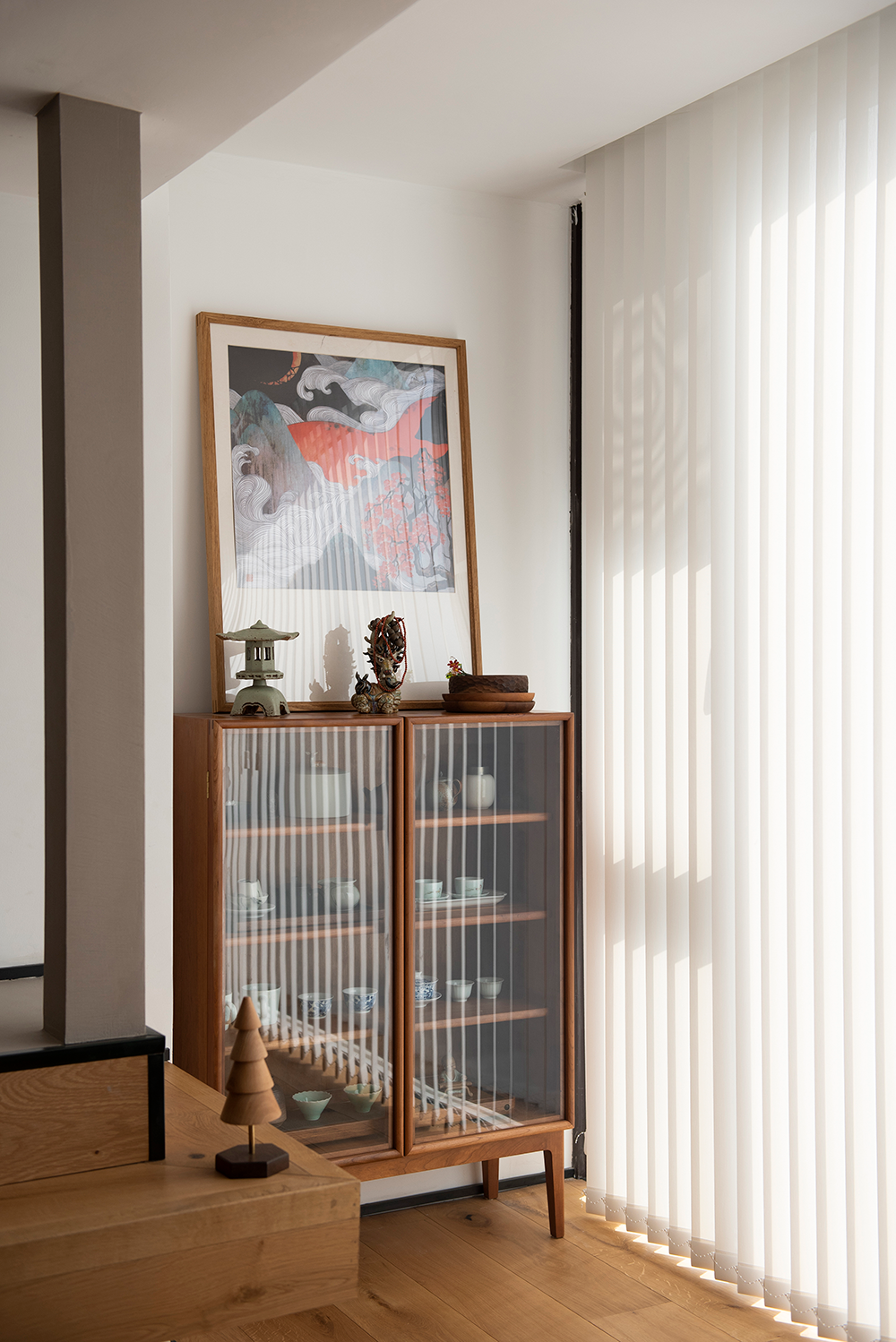 公共区域在白色的基底下,使用大量的木质元素从纹理自然的木地板到餐桌、木饰面,木材温润的色泽给空间带来质朴的舒适感,营造了一种悠然、放松的生活方式,增添室内的温暖与舒适。
