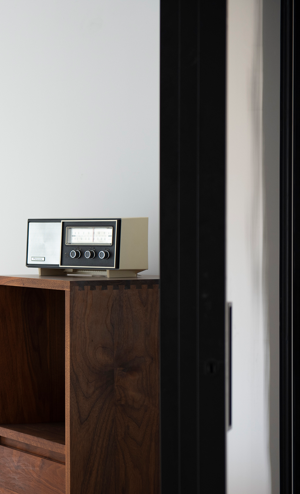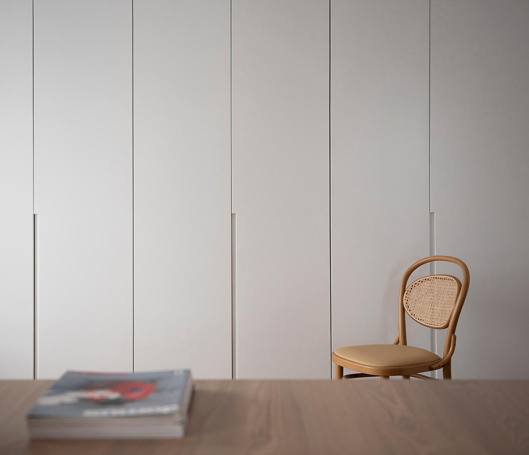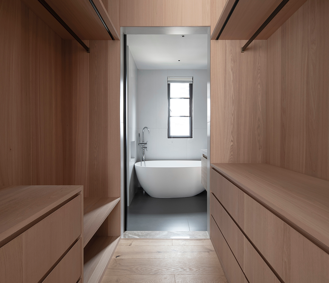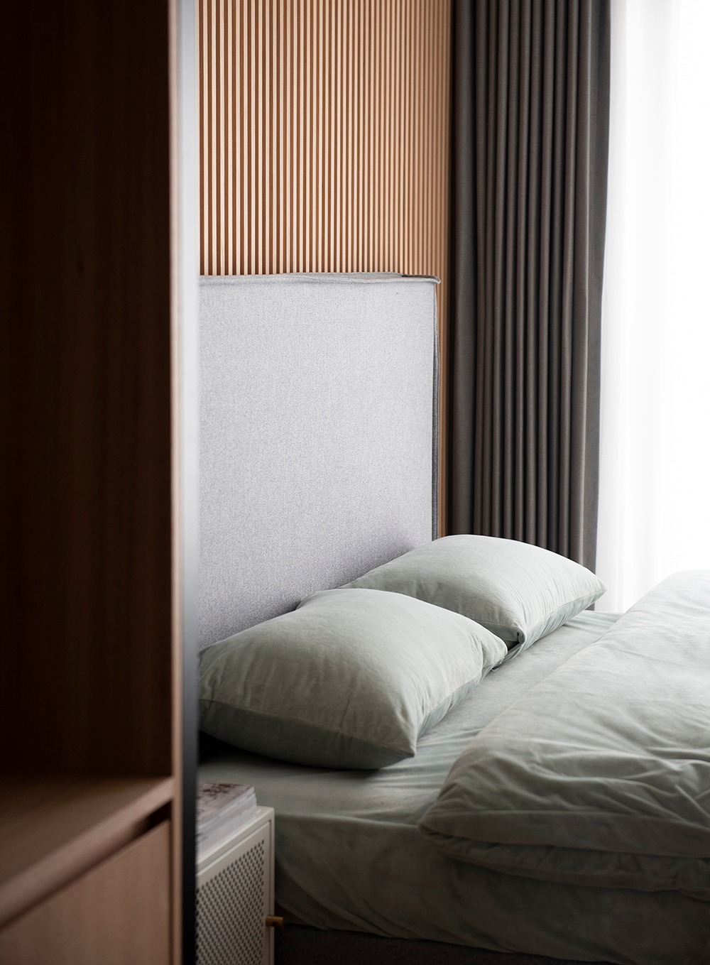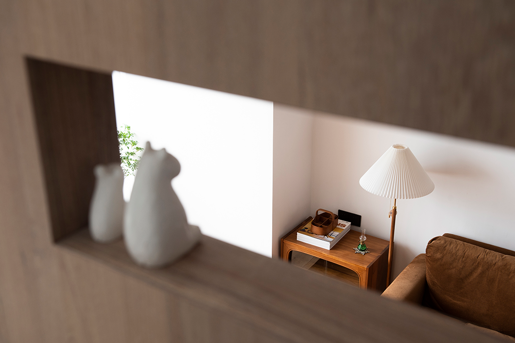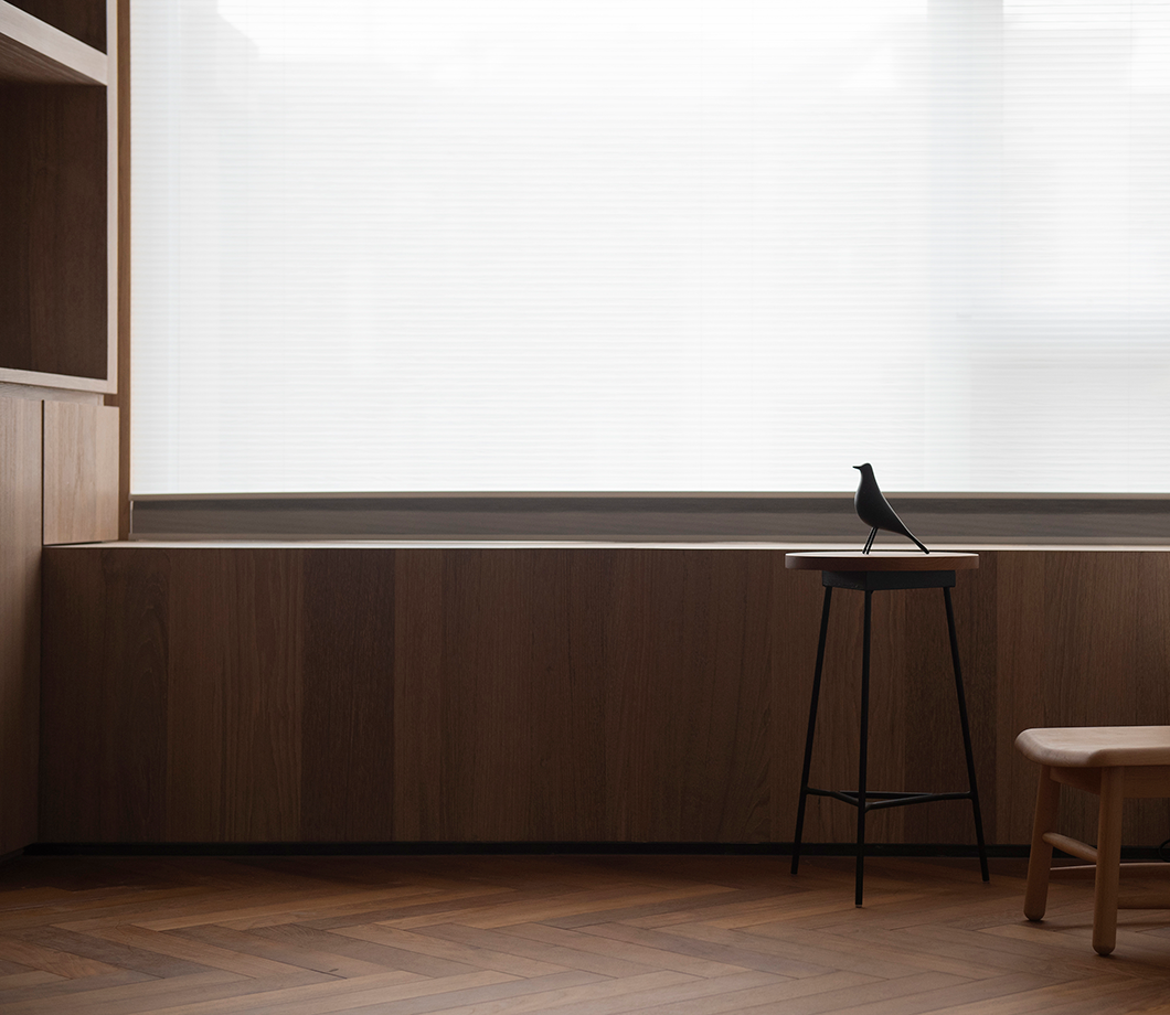 公共区域在白色的基底下,使用大量的木质元素从纹理自然的木地板到餐桌、木饰面,木材温润的色泽给空间带来质朴的舒适感,营造了一种悠然、放松的生活方式,增添室内的温暖与舒适。