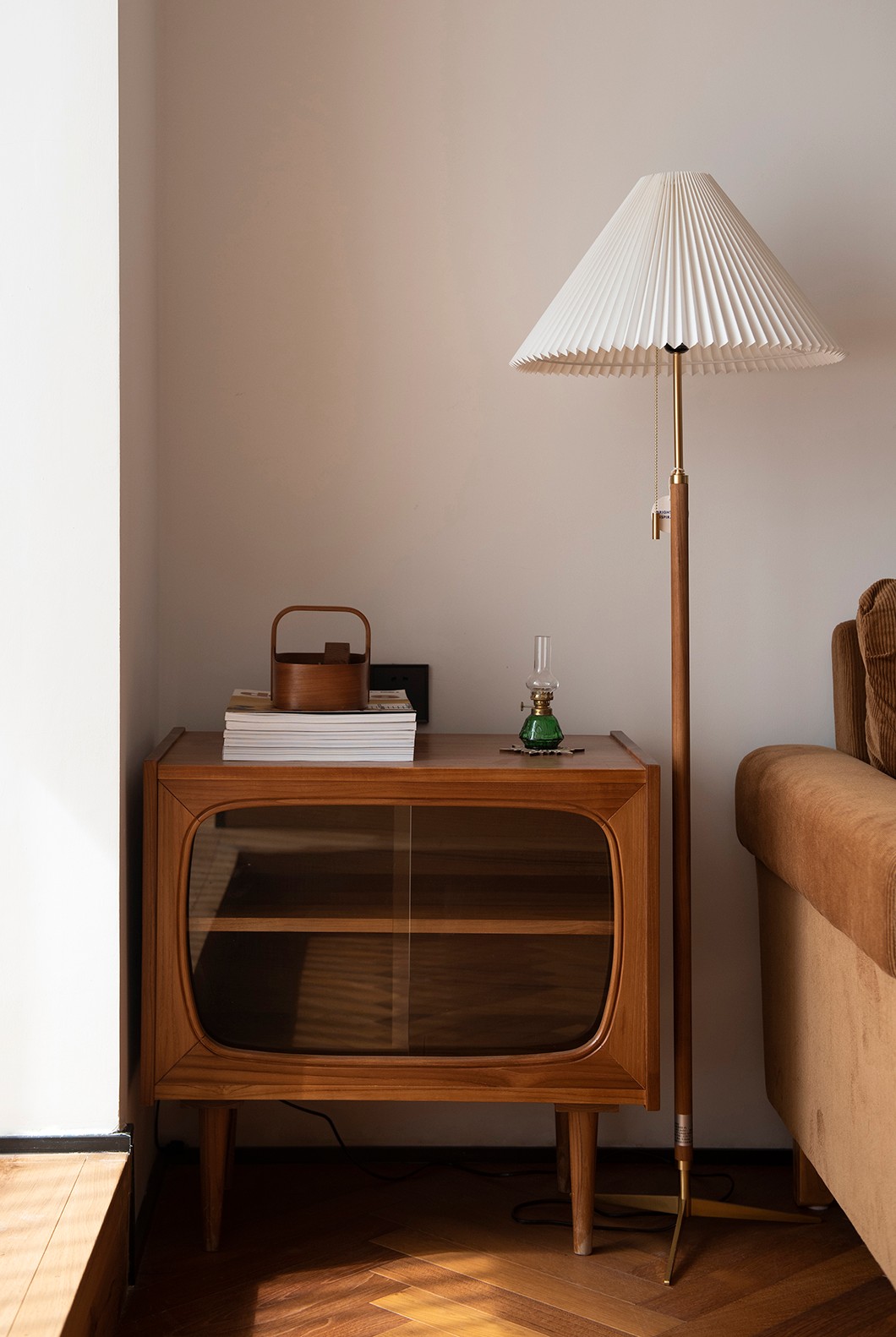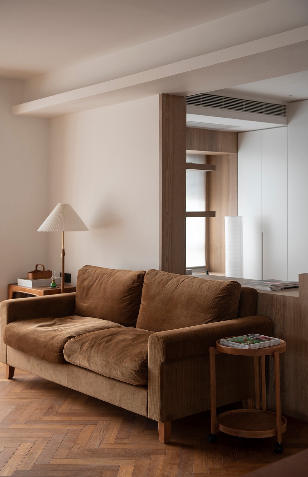 驼色灯芯绒沙发,带着它独特的纹理,看上去久远而质朴,与实木搭配起来却是温暖而独特的。
