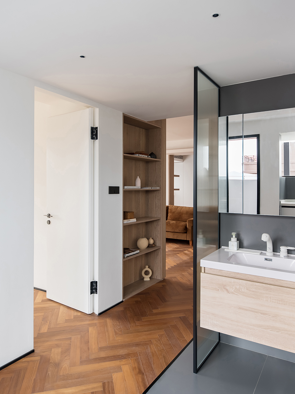地面采用了鱼骨拼的多层橡木木地板,也成了空间的一大亮点。