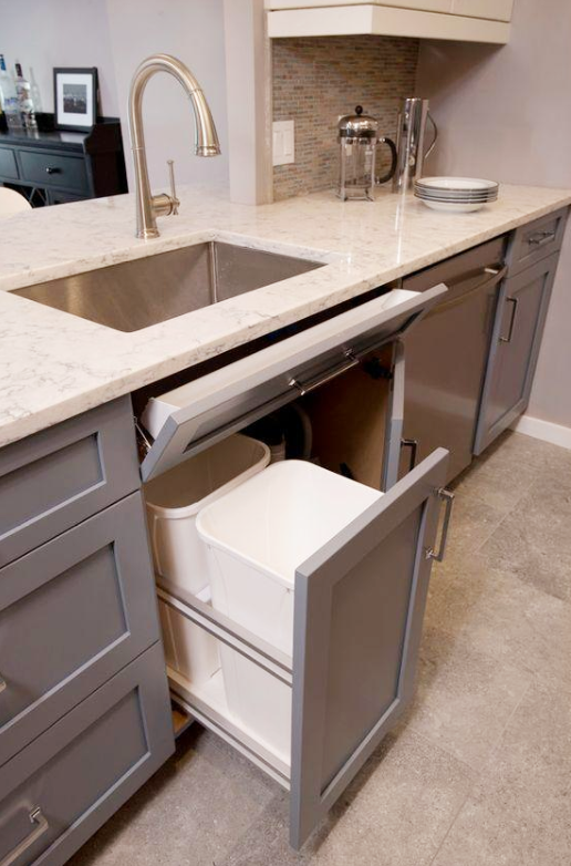 这也是一种增加收纳的做法。在水槽前可以作为一个台面“滤水架”,无需再摆放到台面上,更加的安全,也更加的实用。