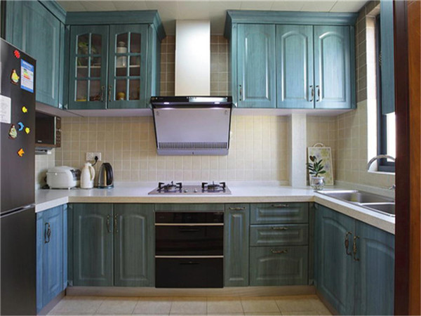 这款地中海风格装修的厨房给人以强烈的视觉冲击,最让人感觉意外的就是实木拱形的吊顶,营造出清新自然的氛围;厨房总体所用色调不多,也就是白色橱柜和蓝色台面的搭配,但正是这种简单的色调搭配会让人在夏季不会感觉燥热难耐。