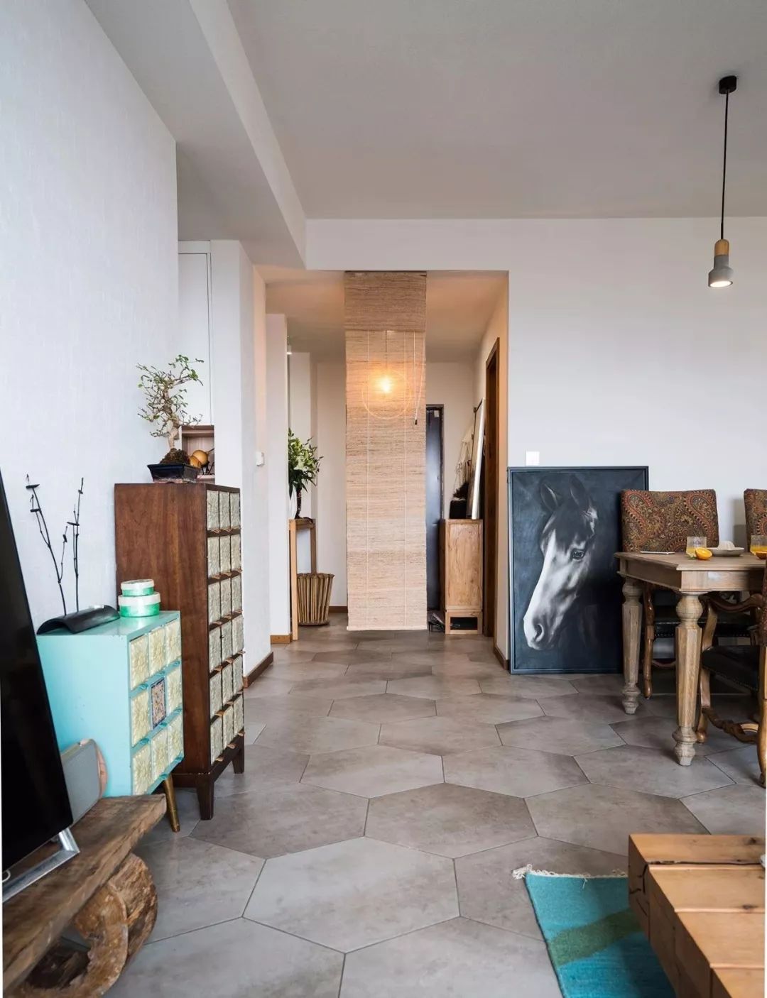 入户门正对着阳台,所以设计师在玄关处加上了一个帘子作为遮挡和隔断。走过玄关就到了客餐厅空间,地面通铺灰色系的六边砖,显得文艺而又简约。