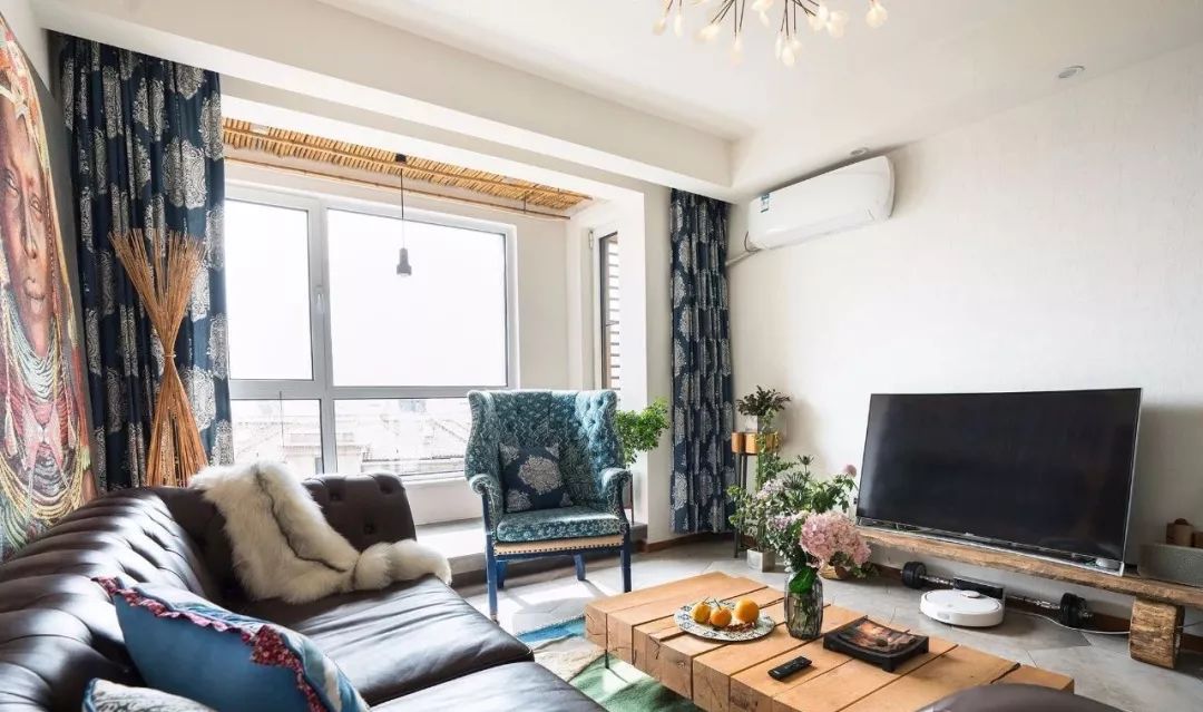 电视背景墙处是没有做任何的装饰,客厅和阳台之间打通,加上窗帘也能起到遮挡的效果,木质隔板作为电视柜,搭配矮茶几,很有自然气息。