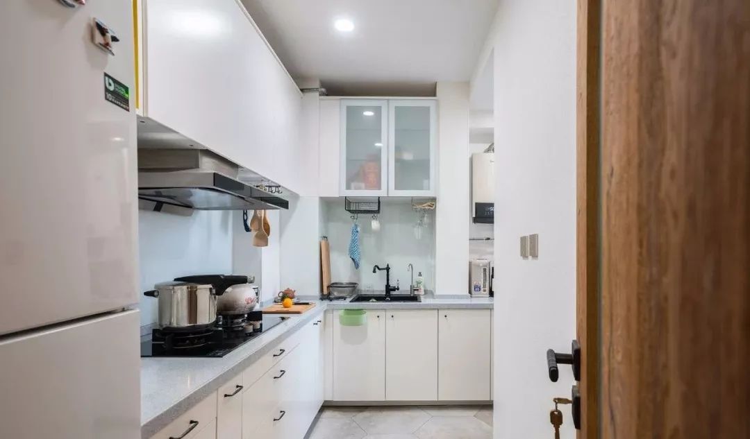 厨房是个L型的不规则空间,所以也沿着户型做了L型的橱柜,灰色的地砖和台面搭配白色的柜子,显得简洁而又大方。