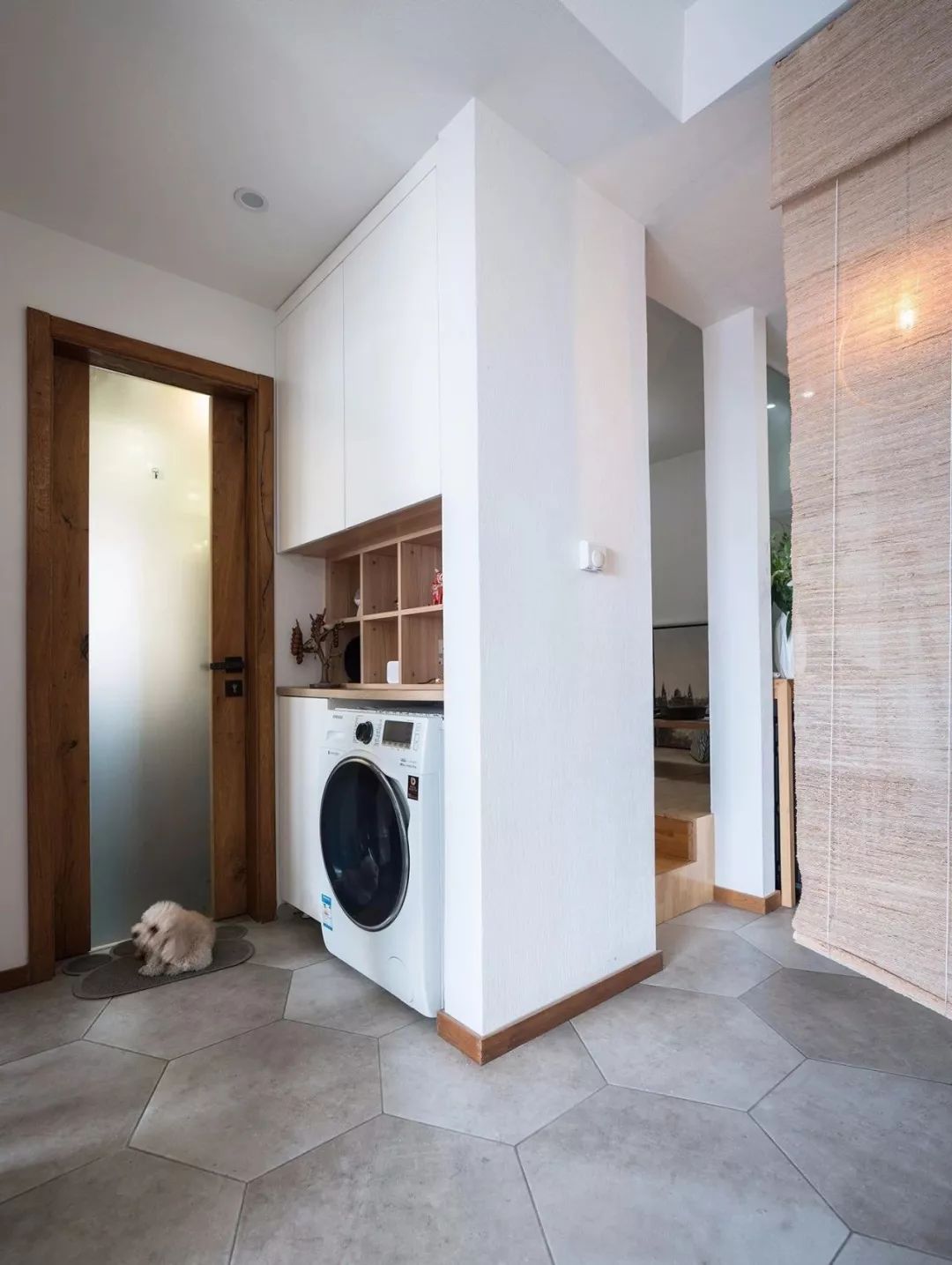 卫生间的门外被设计师利用起来做了储物和摆放洗衣机,洗衣机嵌入柜子当中,上方开放式的搁架搭配柜子使用,非常实用。