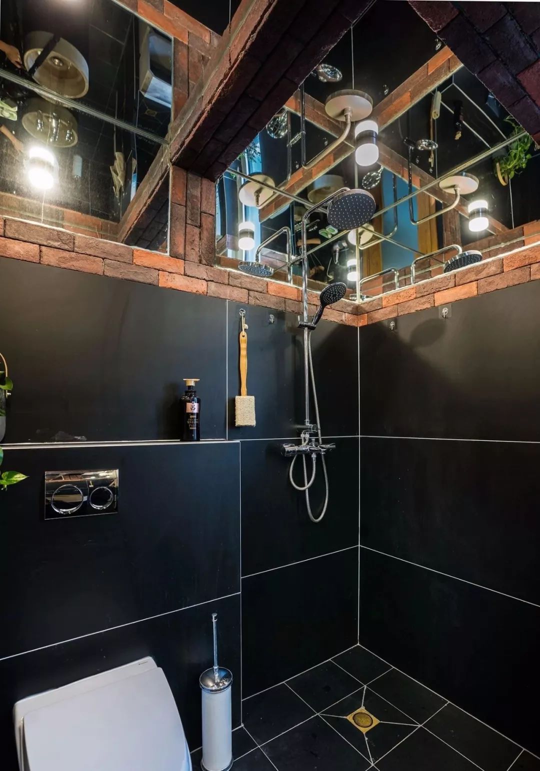 卫生间内部也是非常个性化的设计,以黑色作为主色,顶部的吊顶做了红砖墙与镜子相间的设计,大面积的镜子也能扩大卫生间的空间视觉感。