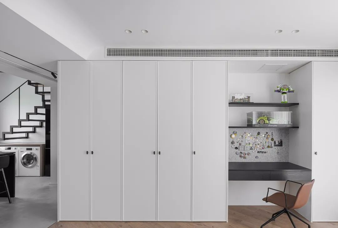▲ 业主希望在工作的时候,也能随时看到另一半,所以将工作区规划在客厅,置顶柜体保持空间干净整洁,书桌右侧是给业主设置的零食柜