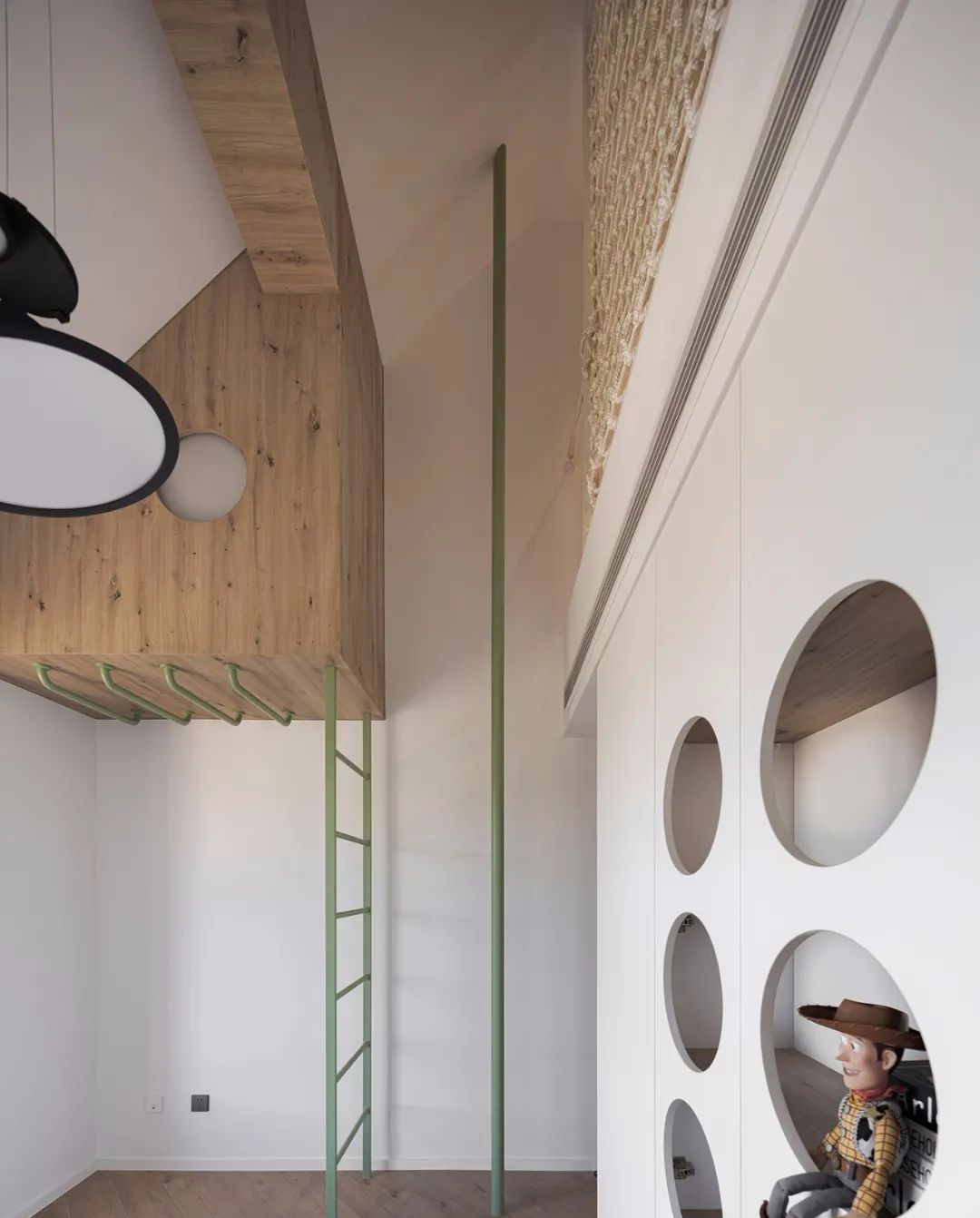 ▲ 虽说业主多年后才考虑要小孩,但还是预留了可以作为儿童房的空间,当前是作为健身房使用,儿童房顶部也被拆掉,还设置了滑竿,可从楼上直接溜下来