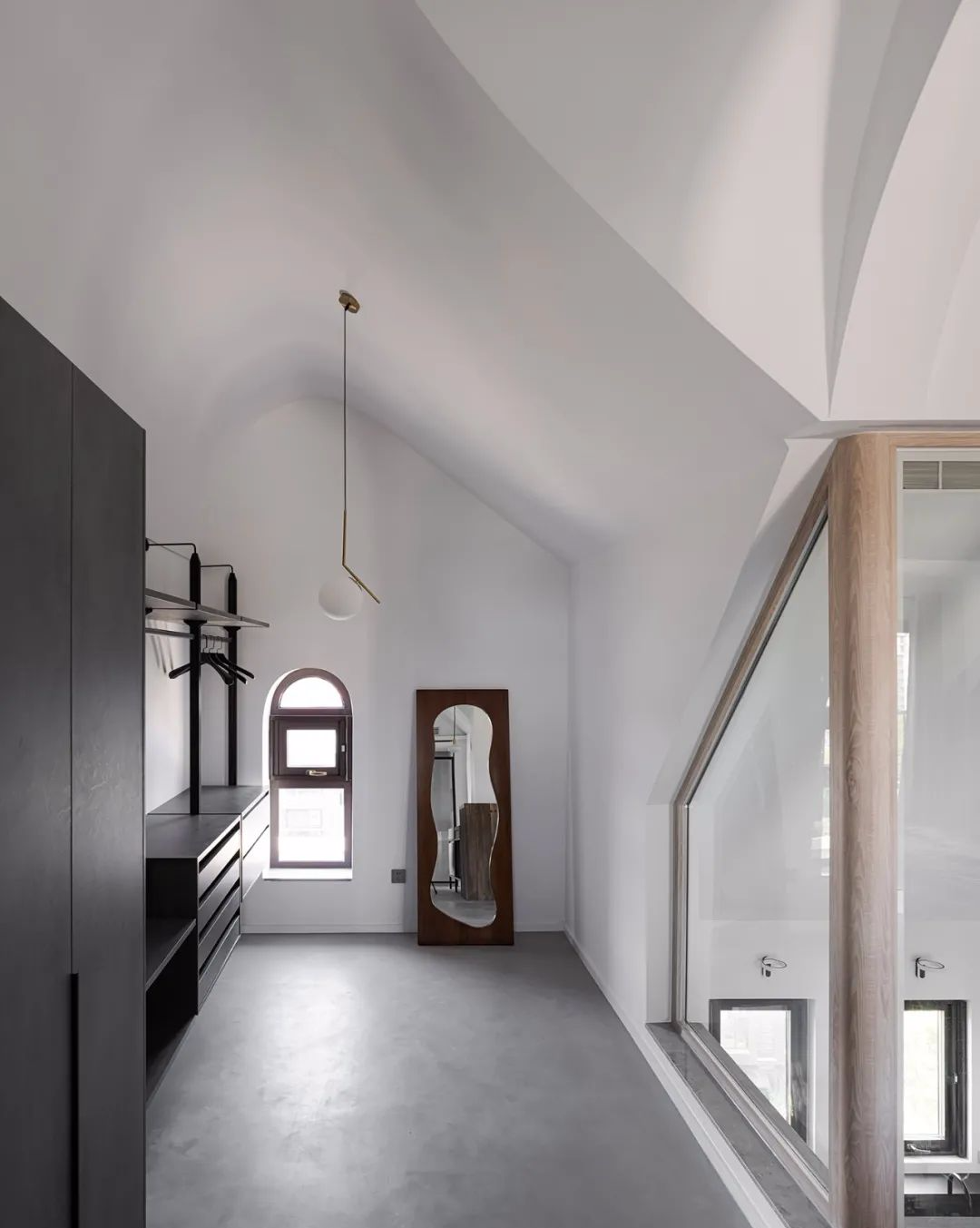 ▲ 另一边是衣帽间,二楼做弧形吊顶设计,增添了艺术氛围也柔和了空间