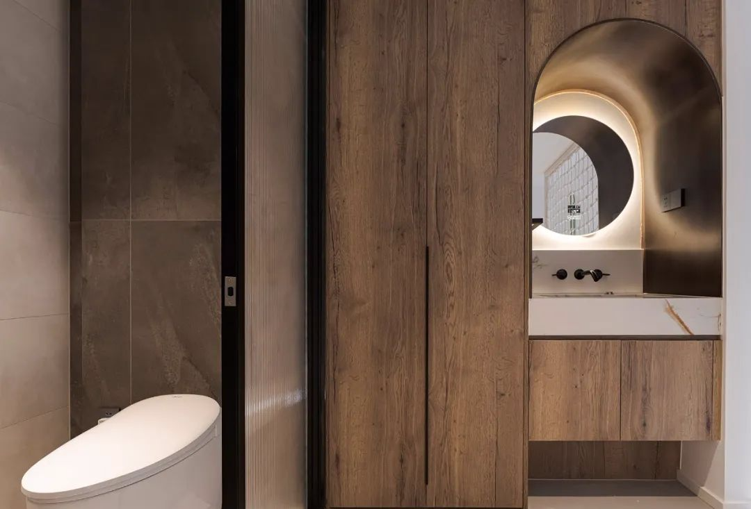 ▲ 台盆区做拱形造型,左侧高柜内置Mini洗衣机