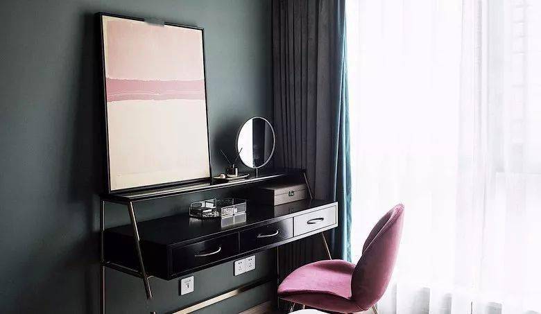 卧室,黑色和墨绿是很好的搭配,软装上选用了一张黑色的梳妆台,红色的椅子,人字拼地板,质感满满。