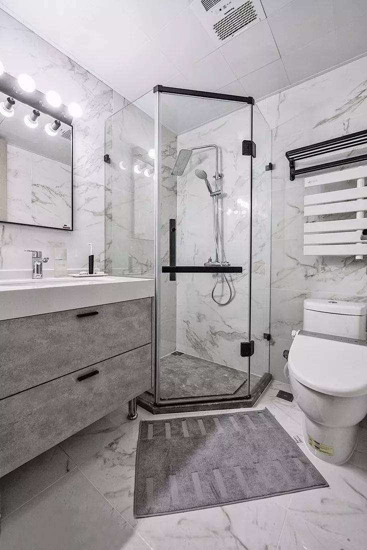 卫生间利用角落空间设立了淋浴区,提高空间利用率。经典灰白色搭配,整体时尚简约。