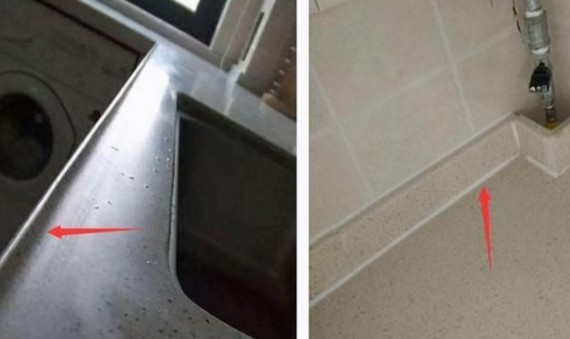 每次洗碗洗菜都会搞的厨房地面全是水渍,然后脚一踩厨房地面就脏得要命,全是黑乎乎的脚印子,每天厨房都要拖3次地面,真的烦都有烦死了。所以厨房台面的挡水条一定要记得安装,台面前后都需要安装,防止水流到柜子后面导致发霉,前面防止台面水流到地面。