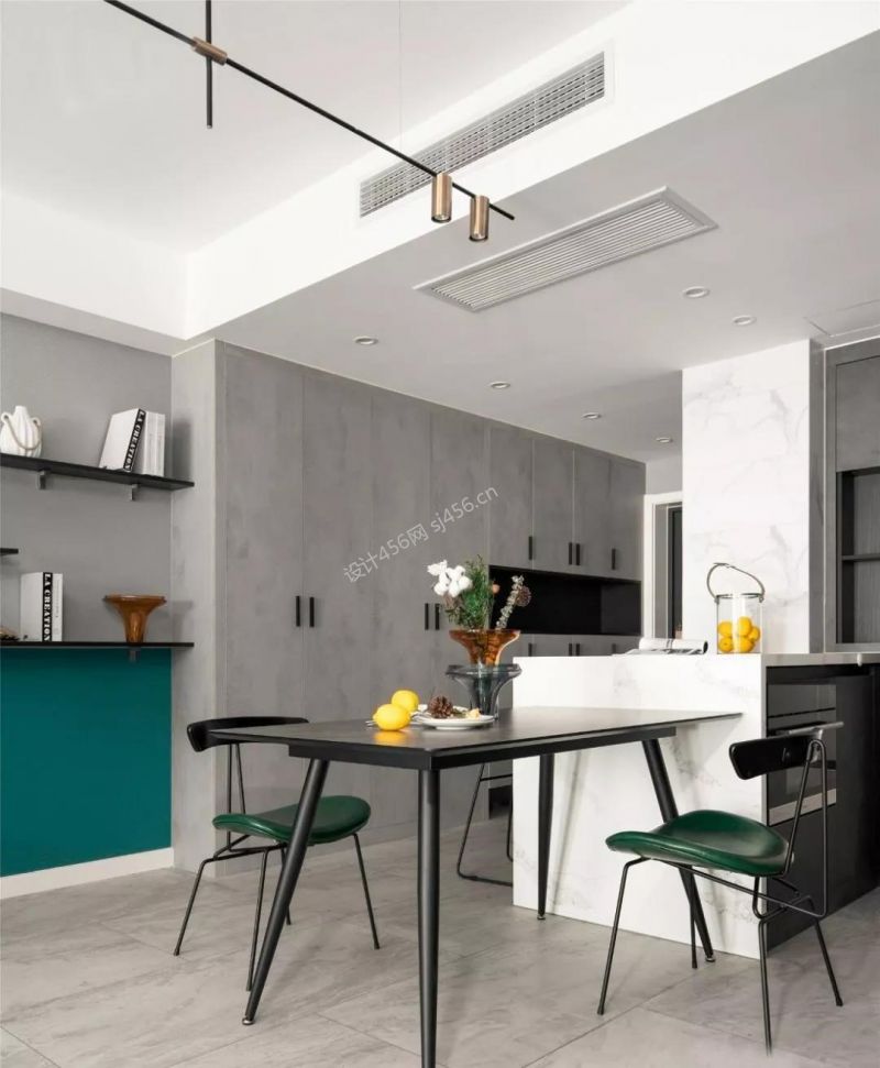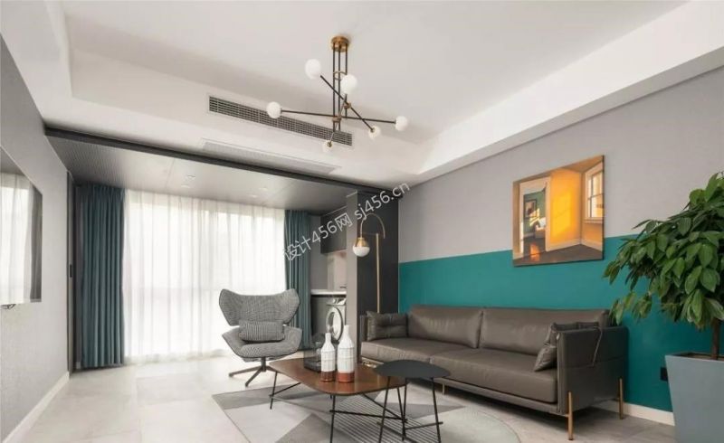 设计理念: 今天分享的这组现代简约风格84平小户型装修,我最喜欢客厅孔雀绿+灰色调的沙发背景墙板墙设计,加上皮质沙发茶几组合的辅助,有点轻复古旧时光的感觉。 今天分享的这组现代简约风格84平小户型装修,我最喜欢客厅孔雀绿+灰色调的沙发背景墙板墙设计,加上皮质沙发茶几组合的辅助,有点轻复古旧时光的感觉。