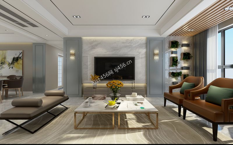详情现代轻奢风格122㎡三居室客厅电视墙设计效果图