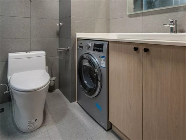 卫生间将洗手台外移,内部壁挂式马桶,马桶旁便是洗衣机,整体布置相当实用了。