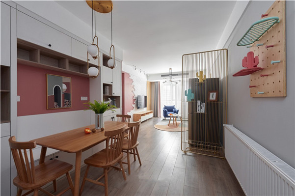 原木元素的家具、色块拼接的地毯、装饰画,让整个空间瞬间活跃了起来。