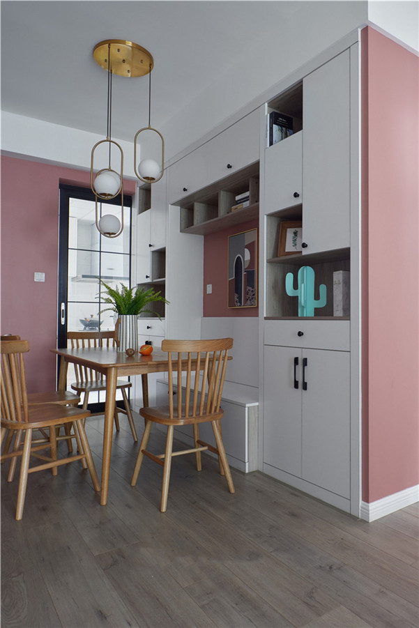 左右两边餐厅柜结合,节省空间的同时,还带出咖啡馆一样的悠闲情调。柜子藏露结合,储物能力也是MAX!