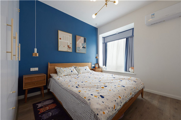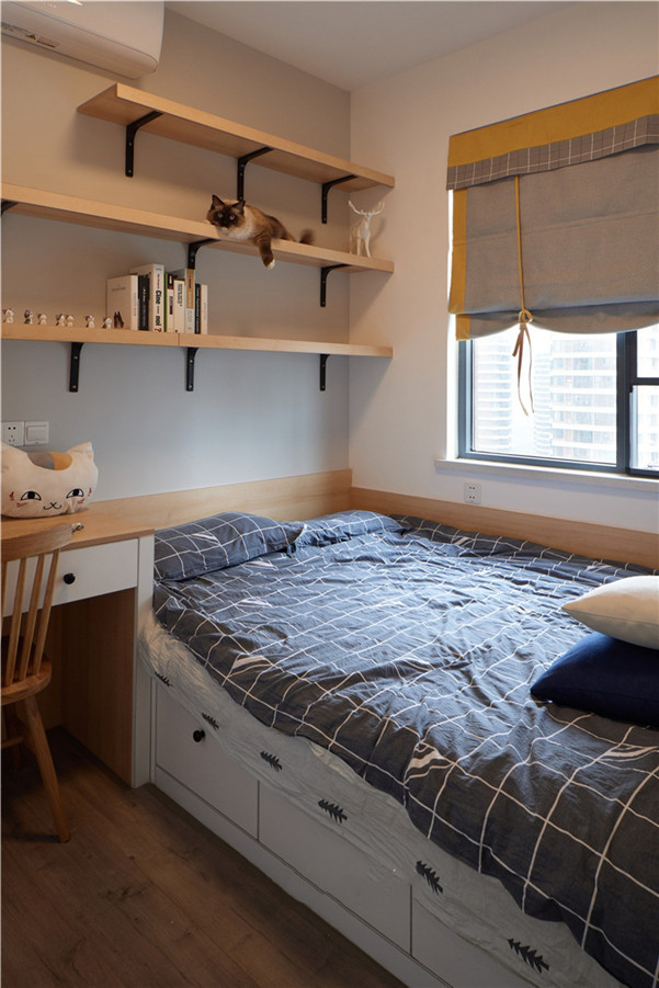 沉稳的蓝色有助于睡眠。顶天立地的大柜子,把一年四季的衣服和被褥都收拾得“服服帖帖”。